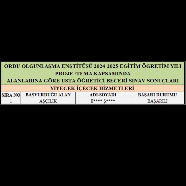 Ordu Olgunlaşma Enstitüsü 2024-2025 Eğitim-Öğretim Yılı Proje/ Tema Kapsamında Alanlarına Göre Usta Öğretici Beceri Sınav Sonuçları Açıklanmıştır.